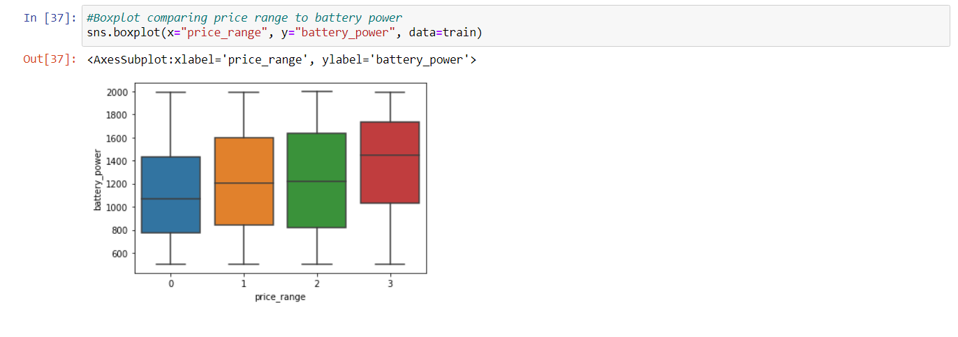 I then made a boxplot showing the comparison between price range and battery_power. As you can see from the graph below there is some comparison between price range and battery power.