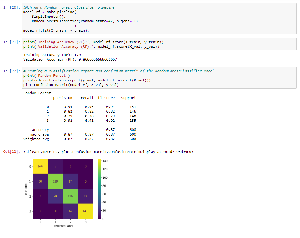 In the second model, I used a standard scaler and random forest classifier. We set the random state to 42 and are n jobs to -1. When we look at the accuracy score we can find a 1 for the training set and a .86 for the accuracy score.