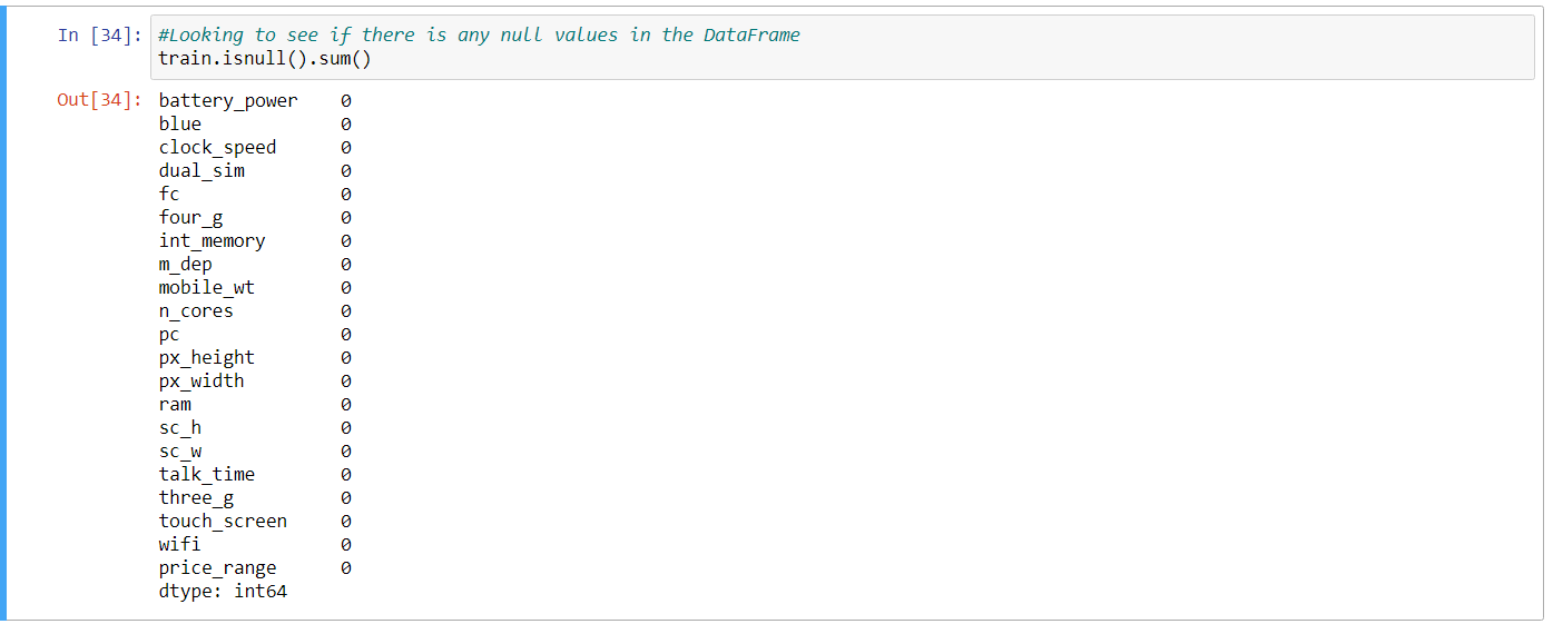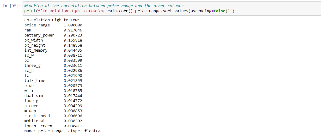 I am using a dataset that was found on Kaggle to predict the price range of cell phones based on the features for the phone. The first thing I did was load in the data frame and check for NaN values and check the correlation between price range in the data frame.