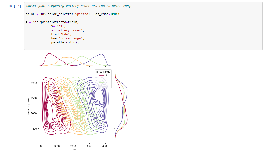 Since we saw a huge correlation between ram and price range we decided to make myself a joint plot. we used my X as ram and my Y as battery power. we then put my hue as price range to see if both of them greatly impact the cell phone price. You can see a huge impact with ram to price range from the graph below.