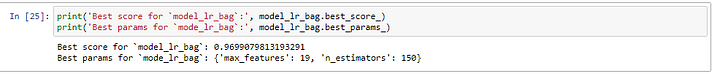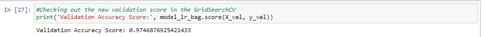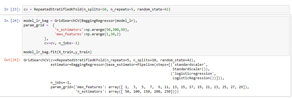 We are now going to start tuning our logistic regression model since it had the best results. I will be using a grid search cv and putting our model in a bagging regressor. We are using the bagging regressor to hopefully help with the overfitting. For the parameters, we choose to be somewhat simple. We are figuring out are best n estimators and max features for the model to help improve it.